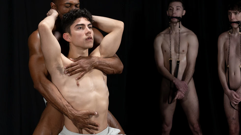 When he starts with each candidate, he adapts his testing based on his instincts and the responses he receives. As each candidate is brought to the platform, his orders to them are simple, direct, and his touching is personalized, erotic. The first candidate for mare was Christopher White who started with a slight smile but ended totally aroused and submissive. The second was Kyle Brooks starting with a slight fear in his eyes, and ending with a flared nose when Stable Master Sean stripped down to his sweaty jock, sending a waft of male pheromones for all to enjoy. Then Alfonso Osnaya was brought to the center already aroused by the Stable Master’s bulge and ending when he was being manhandled and his face was shoved in the Stable Master’s jock pouch. After assessing their bodily reactions, their bodies and their level of arousal, it gave him the knowledge to bridle them into the herd, with no going back, no way out.